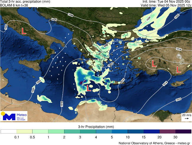 Σύμφωνα με τα νεότερα προγνωστικά στοιχεία του Εθνικού Αστεροσκοπείου Αθηνών/meteo.gr, κατά τη διάρκεια της Τρίτης 04/11 και της Τετάρτης 05/11 αναμένονται τοπικές βροχές και καταιγίδες σε μεγάλο μέρος της χώρας. Τοπικά τα φαινόμενα θα έχουν μεγαλύτερη ένταση και διάρκεια κυρίως σε τμήματα των Σποράδων, της νοτιοανατολικής Μαγνησίας, της Βόρειας και Κεντρικής Εύβοιας και πιθανώς της Δυτικής Κρήτης.