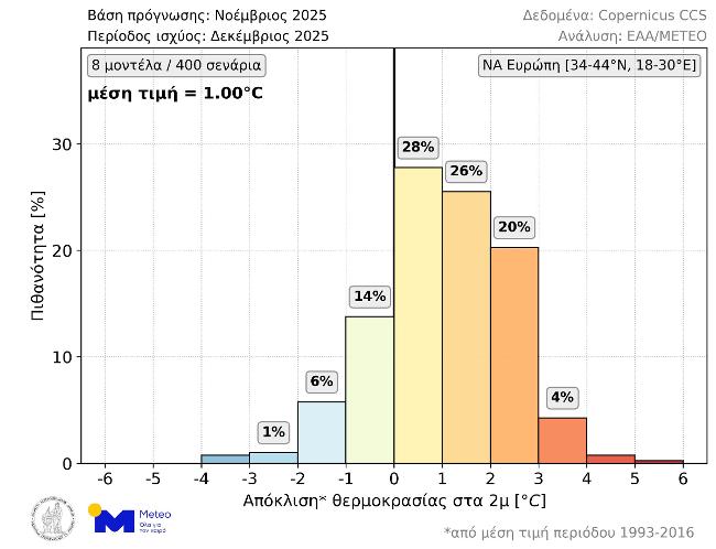 Θερμότερος του κανονικού αναμένεται να είναι ο ερχόμενος Δεκέμβριος στην ΝΑ Ευρώπη (συμπεριλαμβανομένης της Ελλάδας) σύμφωνα με τις μακροπρόθεσμες προγνώσεις που εκδόθηκαν στις αρχές Νοεμβρίου. Όπως φαίνεται στο παρακάτω γράφημα (Εικόνα 1), σύμφωνα με το 78,5% των διαθέσιμων σεναρίων η μέση θερμοκρασία Δεκεμβρίου θα είναι υψηλότερη από τα κανονικά για την εποχή επίπεδα (περίοδος αναφοράς: 1993-2016). Συγκεκριμένα, η πιθανότητα για θετικές αποκλίσεις μεταξύ 0 και 1°C, μεταξύ 1 και 2°C και άνω των 2°C είναι 28%, 26% και 24.5% αντίστοιχα. Οι πιθανότητες για αρνητικές αποκλίσεις μεταξύ 0 και 1°C και άνω του 1°C είναι 14% και 7,5% αντίστοιχα. Η μέση τιμή των 400 σεναρίων είναι +1.0°C.