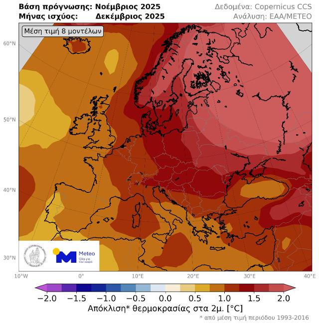 Εικόνα 2. Χάρτης απόκλισης της μέσης θερμοκρασίας Δεκεμβρίου 2025, σύμφωνα με την μέση τιμή των 400 μακροπρόθεσμων προγνώσεων που εκδόθηκαν αρχές Νοεμβρίου.