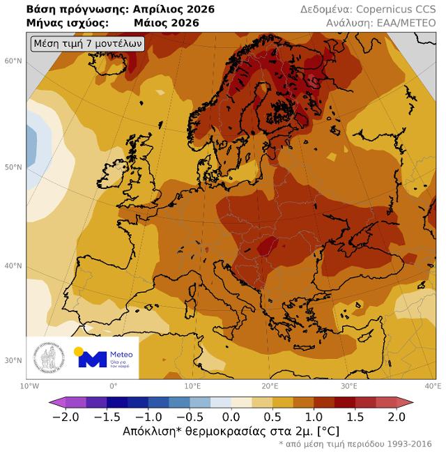 Συνολικά για την ευρωπαϊκή ήπειρο, ο χάρτης της Εικόνας 2 απεικονίζει την απόκλιση της μέσης θερμοκρασίας Μαΐου με βάση την μέση τιμή των διαθέσιμων σεναρίων. Όπως προκύπτει, θετικές αποκλίσεις αναμένονται σε όλη την ήπειρο, με τις τιμές να κυμαίνονται από +0.5°C έως +1.5°C. Οι μέγιστες αποκλίσεις εντοπίζονται στην ανατολική και βόρεια Ευρώπη.