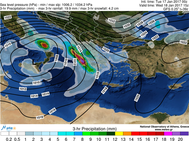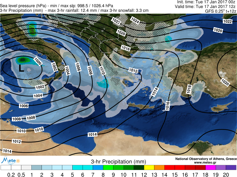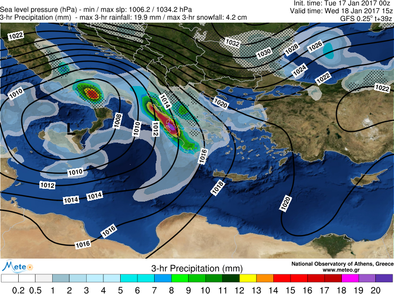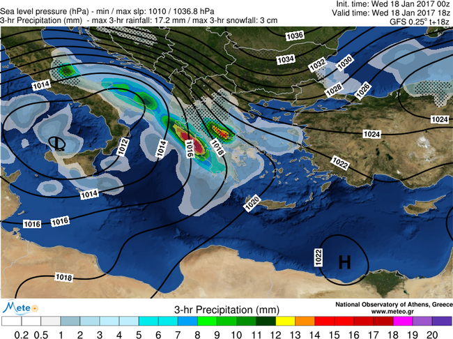 Οι παρακάτω χάρτες δίνουν την κατανομή της πίεσης και του υετού (βροχοπτώσεις και χιονοπτώσεις) το μεσημέρι της Τρίτης 17/01 και το απόγευμα της Τετάρτης 18/01 (πατήστε πάνω τους για μεγέθυνση).