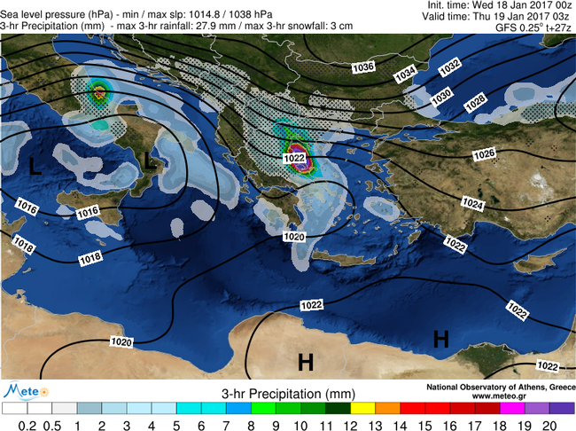 Οι παρακάτω χάρτες δίνουν την κατανομή της πίεσης και του υετού (βροχοπτώσεις και χιονοπτώσεις) το βράδυ της Τετάρτης 18/01 και το ξημέρωμα της Πέμπτης 19/01 (πατήστε πάνω τους για μεγέθυνση).