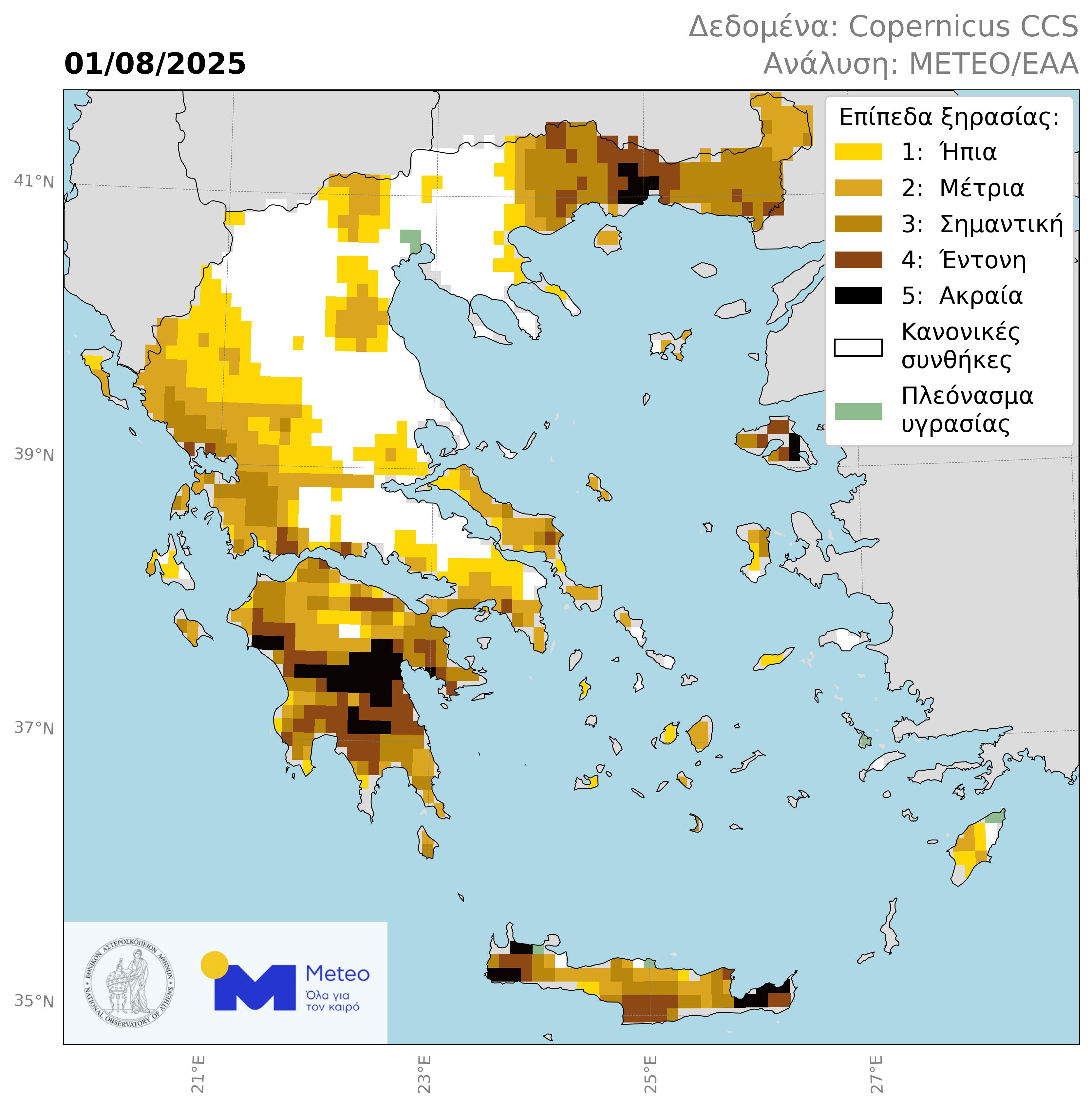 Στον παρακάτω χάρτη απεικονίζεται ο δείκτης ξηρασίας στην Ελλάδα την 1η Αυγούστου 2025, σύμφωνα με την ανάλυση της ομάδας ΜΕΤΕΟ του ΕΑΑ. Όπως προκύπτει, με εξαίρεση αρκετές περιοχές της Μακεδονίας, της Θεσσαλίας και της κεντρικής Στερεάς Ελλάδας, η χώρα βρίσκεται σε συνθήκες ξηρασίας. Μεγάλο μέρος της Κρήτης, της Πελοποννήσου, της ανατολικής Μακεδονίας, της Θράκης και της Λέσβου πλήττονται από έντονη ή ακραία ξηρασία (επίπεδα 4 και 5). Σε κατάσταση μέτριας ή σημαντικής ξηρασίας (επίπεδα 2 και 3) βρίσκονται πολλές περιοχές της Αττικής, της Εύβοιας, της δυτικής Στερεάς Ελλάδας και της Ηπείρου, καθώς και πολλά νησιά της χώρας. Μετά τις ιδιαίτερα υψηλές θερμοκρασίες και χαμηλές βροχοπτώσεις του Ιουλίου, σχεδόν το σύνολο της χώρας βρίσκεται σε υψηλότερο για την εποχή επίπεδο ξηρασίας σε σχέση με τις αρχές του προηγούμενου μήνα.