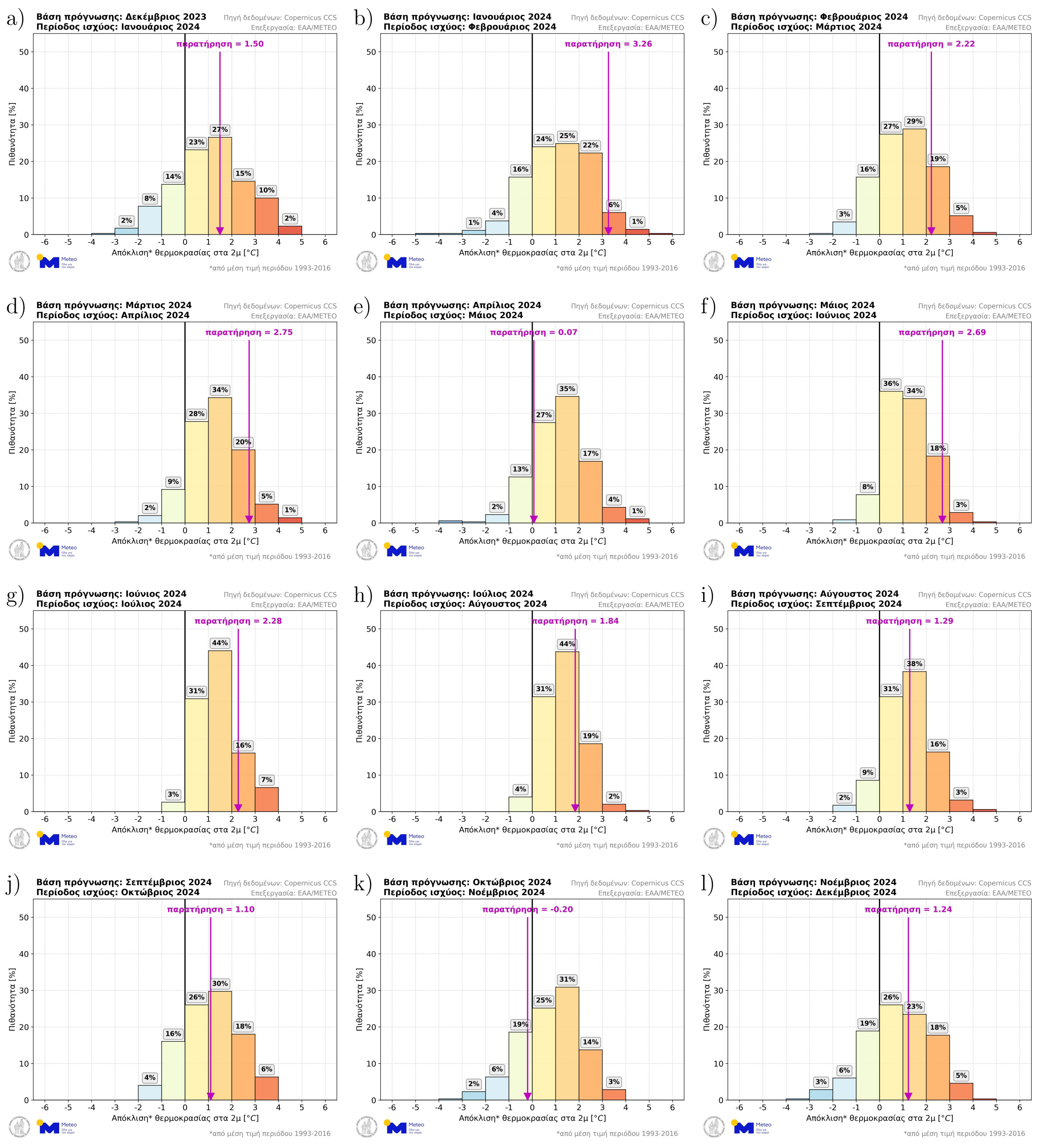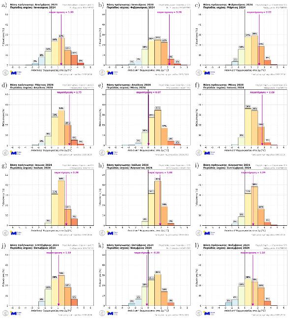 Τα ιστογράμματα των προγνώσεων για κάθε μήνα του 2024 που παρουσιάζονται παρακάτω απεικονίζουν τις πιθανότητες η μέση θερμοκρασιακή απόκλιση (από την μέση τιμή της περιόδου 1993-2016) να βρίσκεται σε συγκεκριμένα πεδία τιμών (π.χ., μεταξύ -1°C και 0°C ή +1°C και +2°C). Πάνω στα ιστογράμματα απεικονίζεται και η θερμοκρασιακή απόκλιση που τελικά παρατηρήθηκε στον εκάστοτε μήνα.