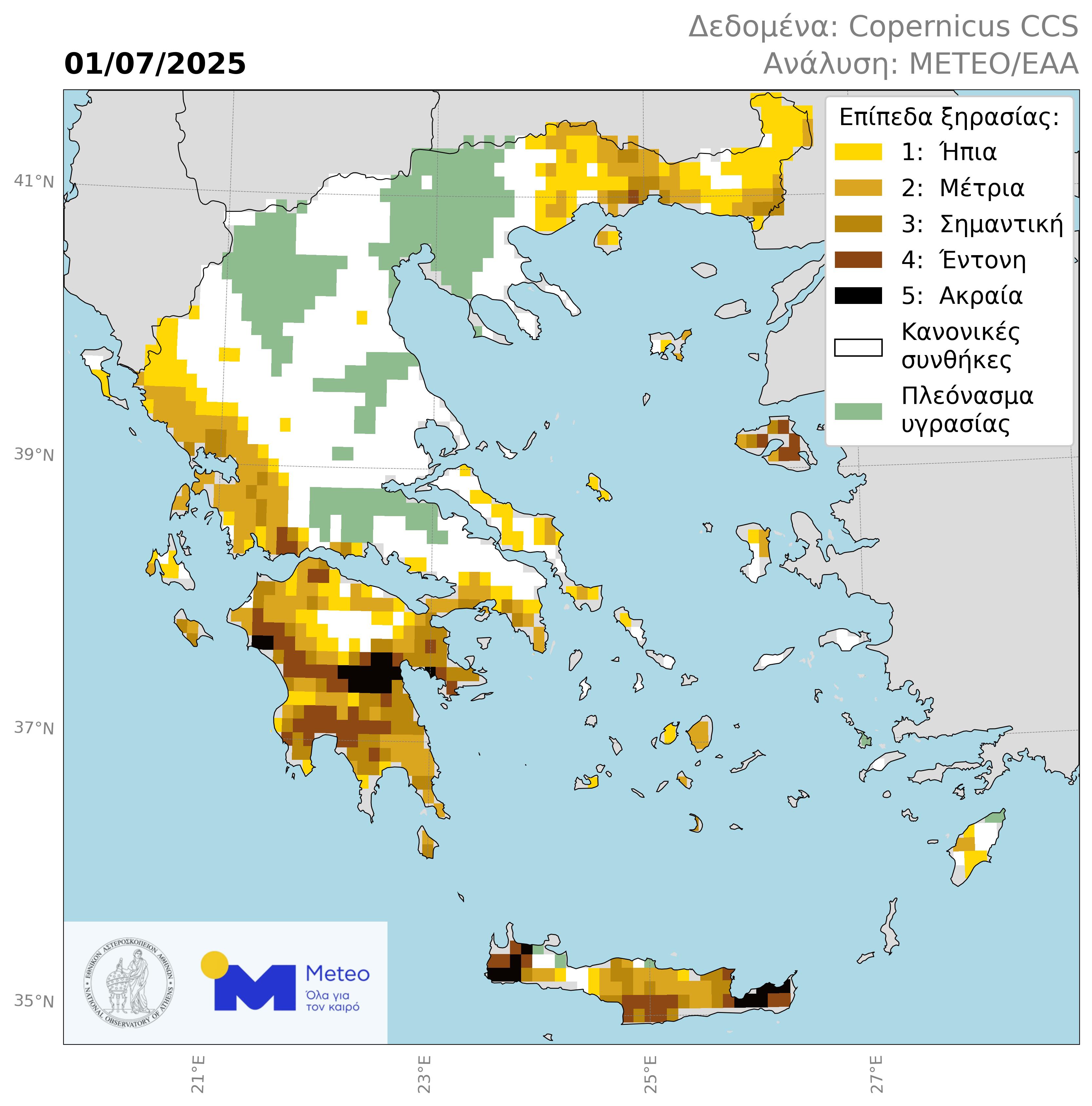 Στον παρακάτω χάρτη απεικονίζεται ο δείκτης ξηρασίας στην Ελλάδα την 1η Ιουλίου 2025, σύμφωνα με την ανάλυση της ομάδας ΜΕΤΕΟ του ΕΑΑ. Όπως προκύπτει, μεγάλο μέρος της Κρήτης, της Πελοποννήσου, της δυτικής Στερεάς Ελλάδας και της Θράκης βρίσκονται σε συνθήκες ξηρασίας. Από έντονη ή ακραία ξηρασία (επίπεδα 4 και 5) πλήττονται αρκετές περιοχές στους νομούς Χανίων, Ηρακλείου, Λασιθίου, Αρκαδίας, Αργολίδας, Μεσσηνίας, Ηλείας και Λέσβου. Μετά τις ιδιαίτερα ψηλές θερμοκρασίες και χαμηλές βροχοπτώσεις του Ιουνίου, σχεδόν το σύνολο της χώρας βρίσκεται σε υψηλότερο για την εποχή επίπεδο ξηρασίας σε σχέση με τις αρχές Ιουνίου.