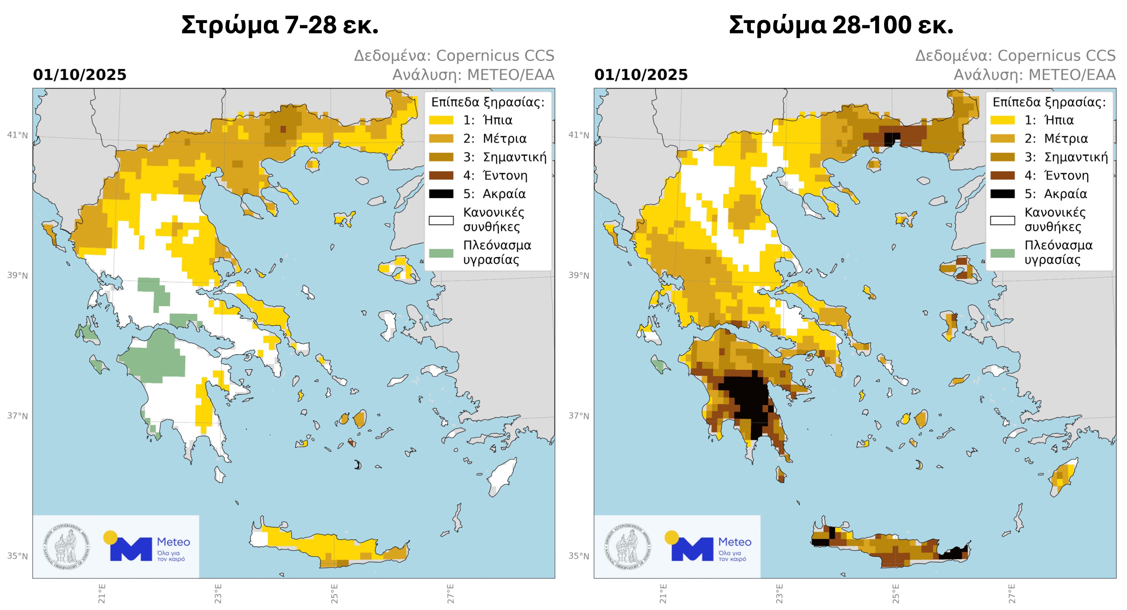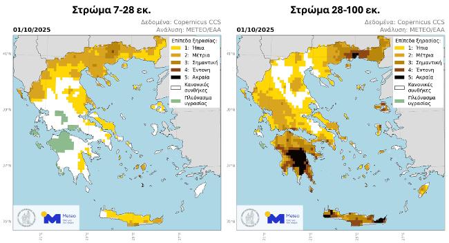 Με βάση τον δείκτη ξηρασίας στο πιο επιφανειακό υπό εξέταση στρώμα υπεδάφους (7-28 εκ.), το μεγαλύτερο μέρος της Βόρειας Ελλάδας, της Θεσσαλίας, της Κρήτης και της Εύβοιας κατά την 1η Οκτωβρίου βρισκόταν σε συνθήκες ήπιας έως σημαντικής ξηρασίας (Εικόνα 1, αριστερός χάρτης).
