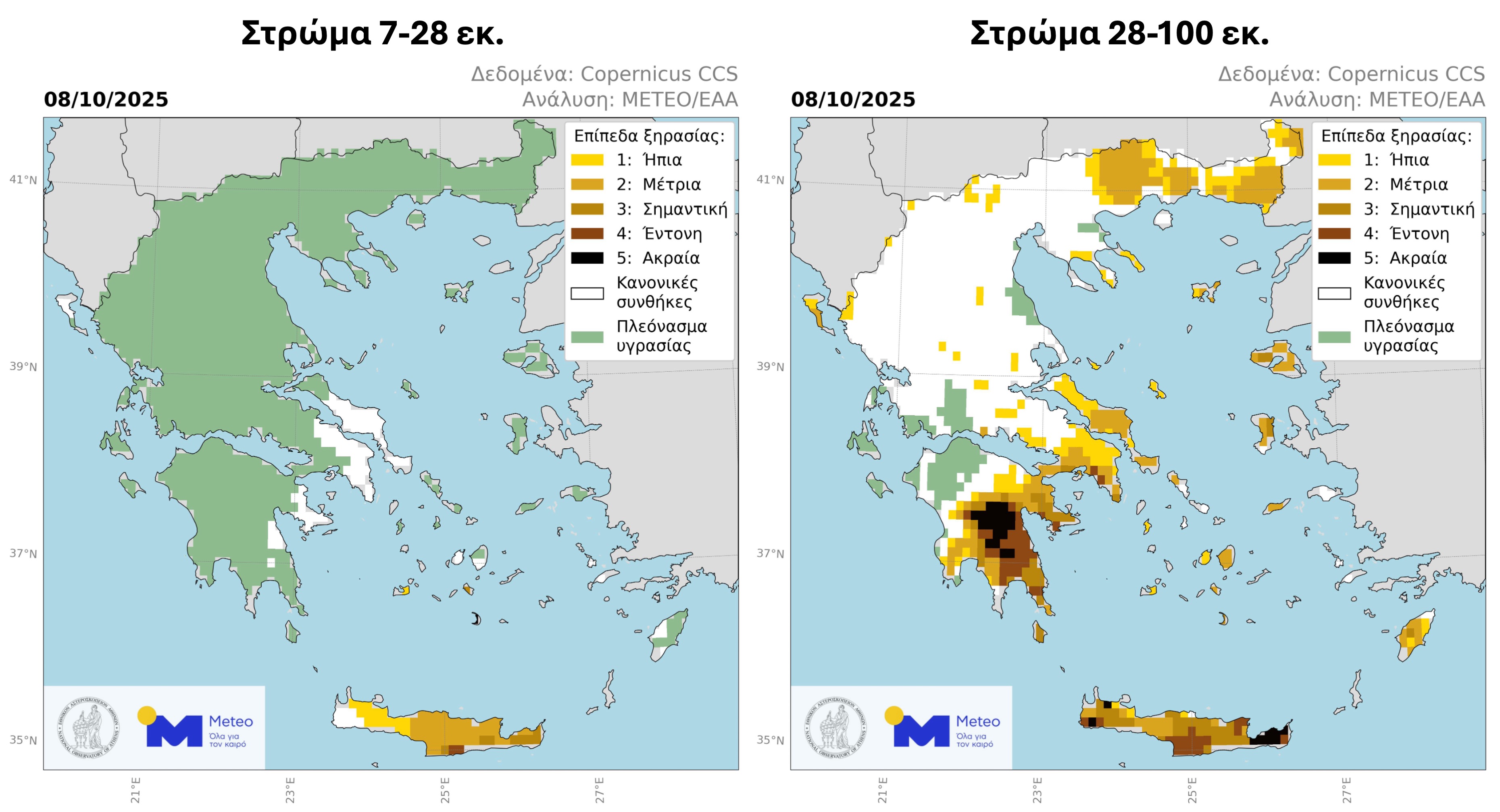 Εικόνα 2. Επίπεδα ξηρασίας στην Ελλάδα κατά τις 8 Οκτωβρίου 2025 στα στρώματα υπεδάφους 7-28 εκ. (αριστερά) και 28-100 εκ. (δεξιά).