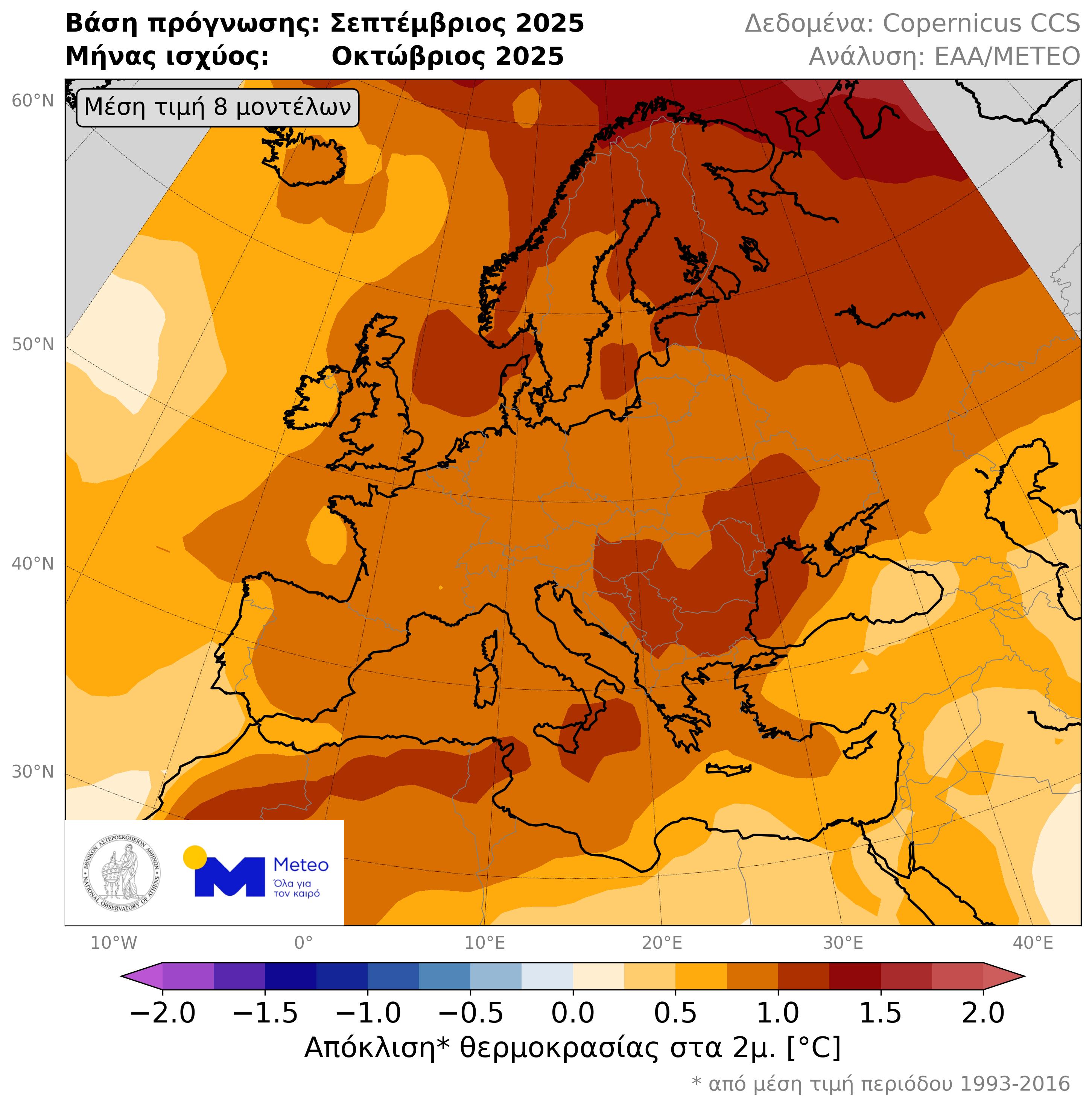 Εικόνα 2. Χάρτης απόκλισης της μέσης θερμοκρασίας Οκτωβρίου 2025 από τη μέση τιμή του 1993-2016, σύμφωνα με την μέση τιμή των 400 μακροπρόθεσμων προγνώσεων που εκδόθηκαν αρχές Σεπτεμβρίου.
