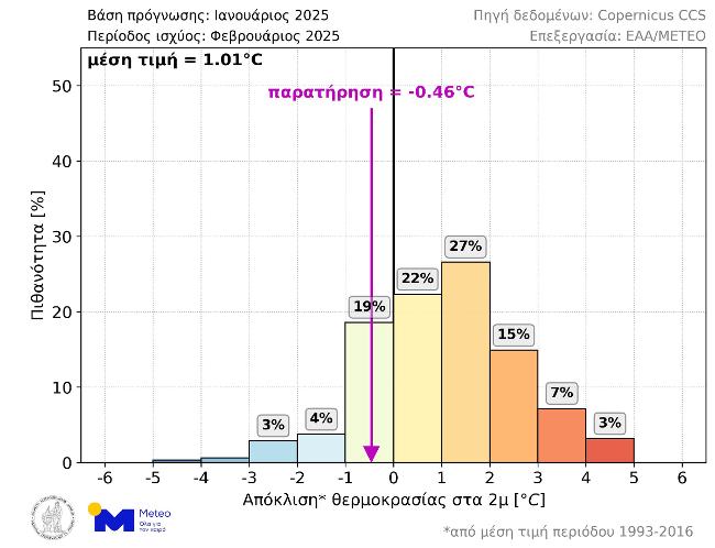 Όσον αφορά τον περασμένο Φεβρουάριο, η μέση θερμοκρασιακή απόκλιση στην ΝΑ Ευρώπη ήταν -0.46°C, ενώ η μέση τιμή όλων των σεναρίων της μακροπρόθεσμης πρόγνωσης που εκδόθηκε τον Ιανουάριο του 2025 ήταν +1.01°C. Όπως φαίνεται στο παρακάτω γράφημα, το μέγεθος της απόκλισης που παρατηρήθηκε είχε πιθανότητα 19% και ήταν το 3ο πιθανότερο πεδίο τιμών στην μακροπρόθεσμη πρόγνωση.