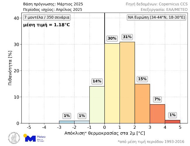 Θερμότερος του κανονικού αναμένεται να είναι ο ερχόμενος Απρίλιος στην ΝΑ Ευρώπη (συμπεριλαμβανομένης της Ελλάδας) σύμφωνα με τις μακροπρόθεσμες προγνώσεις που εκδόθηκαν μέσα στον Μάρτιο. Όπως φαίνεται στο παρακάτω γράφημα, συμφωνα με το 84% των διαθέσιμων σεναρίων η μέση θερμοκρασία Απριλίου θα είναι υψηλότερη από τα κανονικά για την εποχή επίπεδα (περίοδος αναφοράς: 1993-2016). Συγκεκριμένα, η πιθανότητα για θετικές αποκλίσεις μεταξύ 0 και 1°C, μεταξύ 1 και 2°C και άνω των 2°C είναι 30%, 31% και 23% αντίστοιχα. Οι πιθανότητες για αρνητικές αποκλίσεις μεταξύ 0 και 1°C και άνω του 1°C είναι 14% και 2% αντίστοιχα. Η μέση τιμή των 350 σεναρίων είναι +1.18°C.
