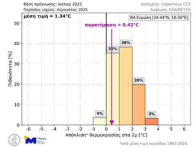 Όσον αφορά τον περασμένο Αύγουστο, η μέση θερμοκρασιακή απόκλιση στην ΝΑ Ευρώπη ήταν +0.42°C, ενώ η μέση τιμή όλων των σεναρίων της μακροπρόθεσμης πρόγνωσης που εκδόθηκε τον Ιούλιο του 2025 ήταν +1.34°C. Όπως φαίνεται στο παρακάτω γράφημα (Εικόνα 3), το μέγεθος της απόκλισης που παρατηρήθηκε είχε πιθανότητα 35% και ήταν το 2ο πιθανότερο πεδίο τιμών στην μακροπρόθεσμη πρόγνωση.
